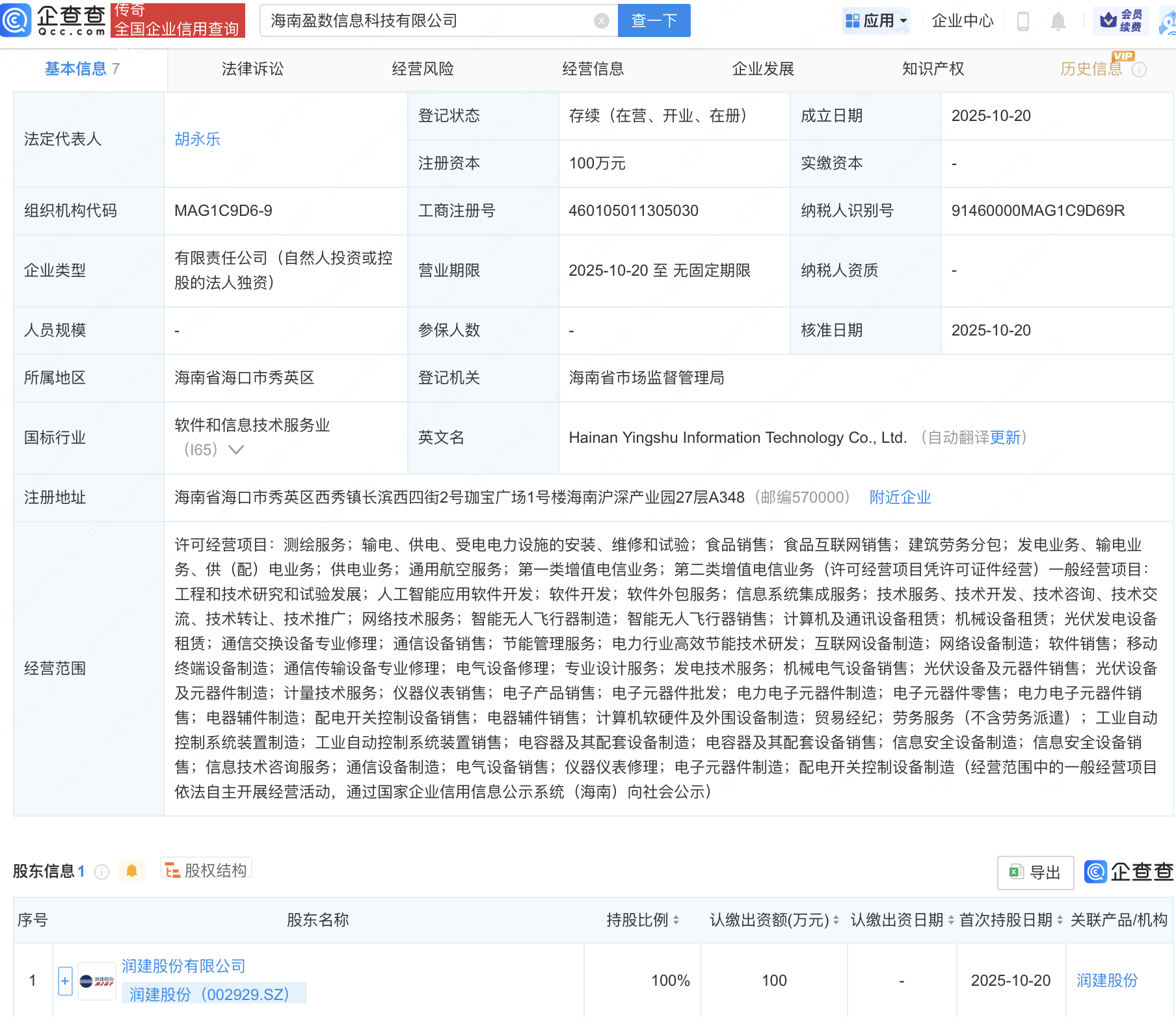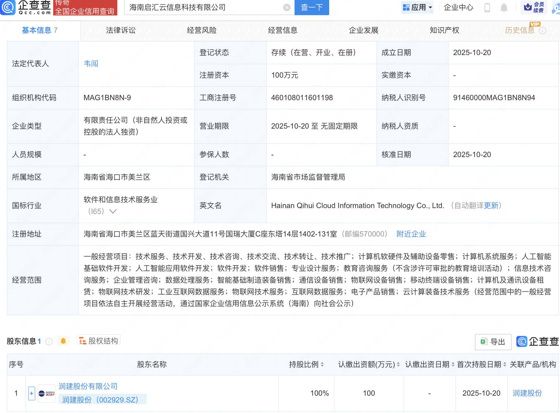 近日,海南启汇云信息科技有限公司、海南盈数信息科技有限公司成立,法定代表人分别为韦闯、胡永乐,经营范围均包含:人工智能应用软件开发;软件开发等。企查查股权穿透显示,二者皆由润建股份(002929)全资持股。